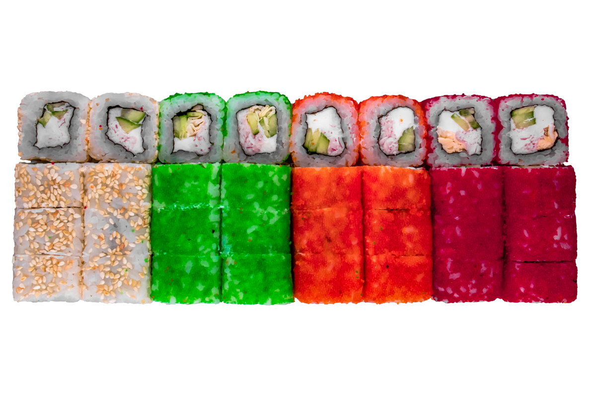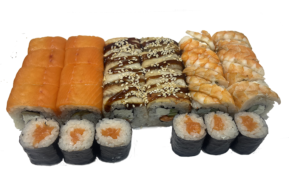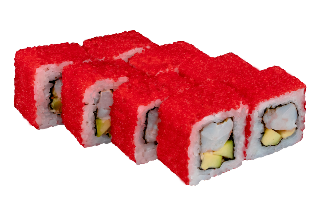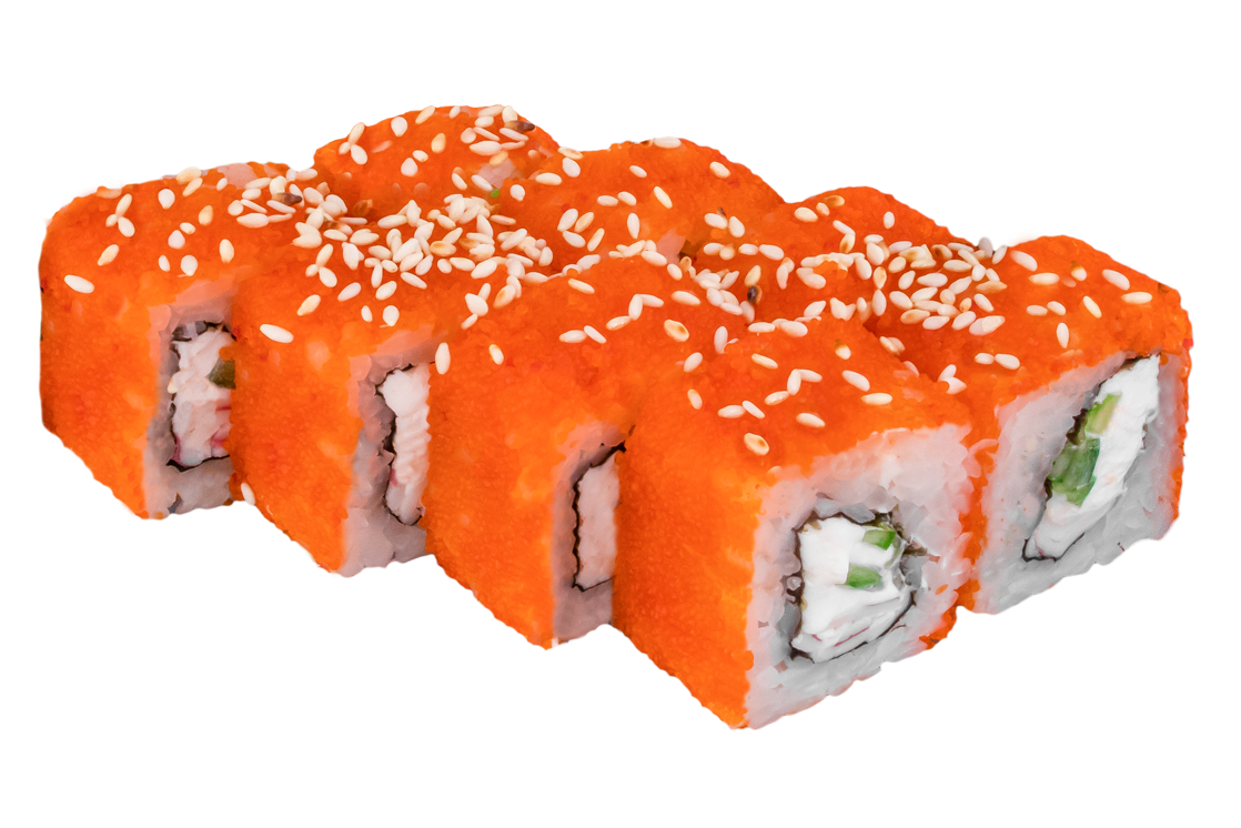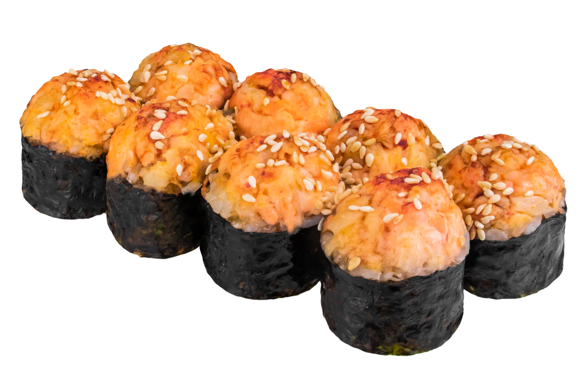 Креветка, окунь, соус розовый, соус спайси, огурец, соус унаги, кунжут