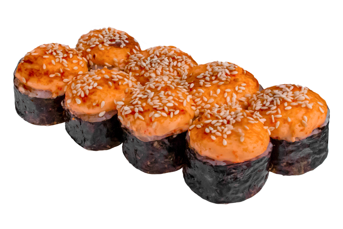 Креветка, окунь, соус розовый, соус спайси, огурец, соус унаги, кунжут